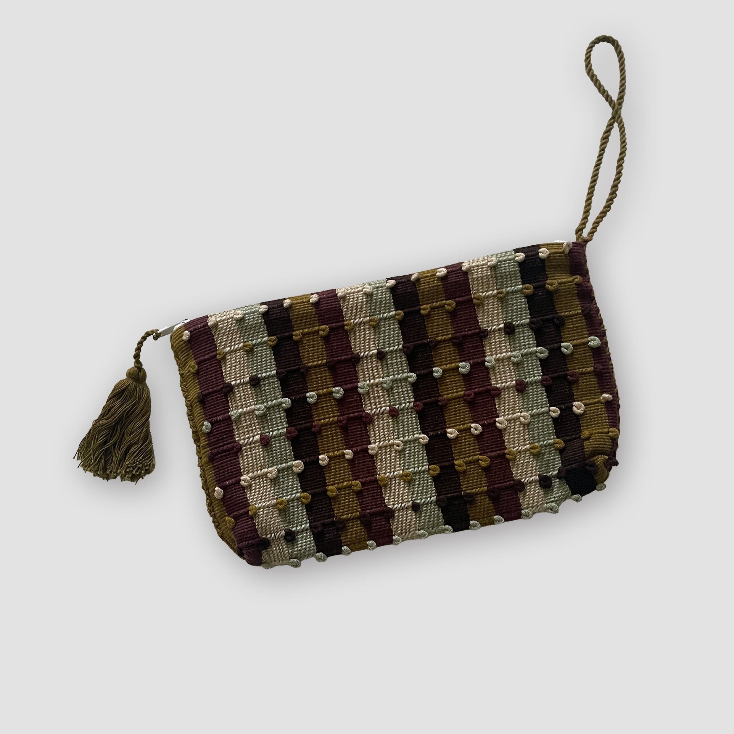 シックなカーキの配色ストライプで、あたたかみのあるデザインです。使いやすい実用的なサイズなので、コスメや日常小物の収納に最適です。